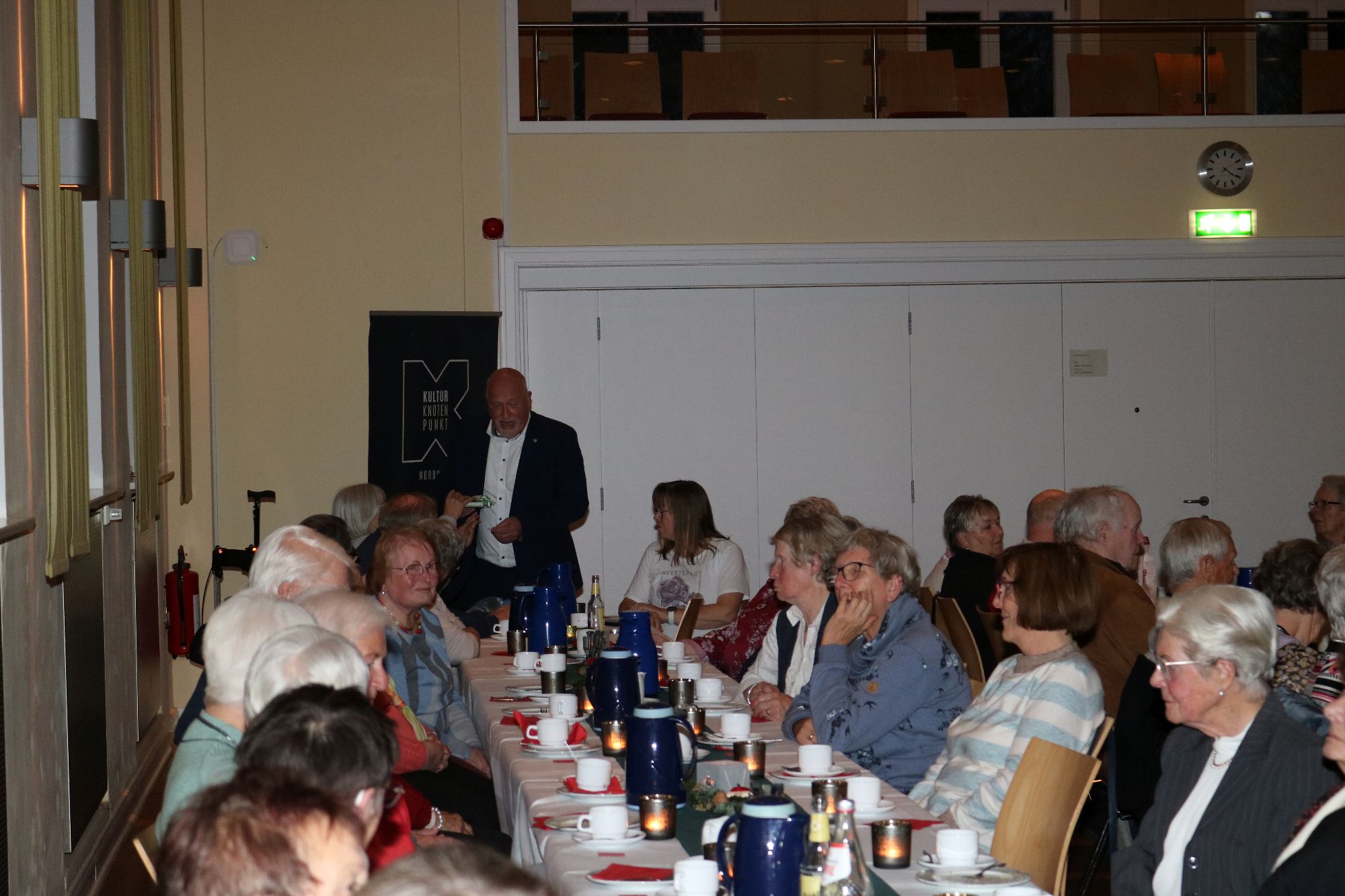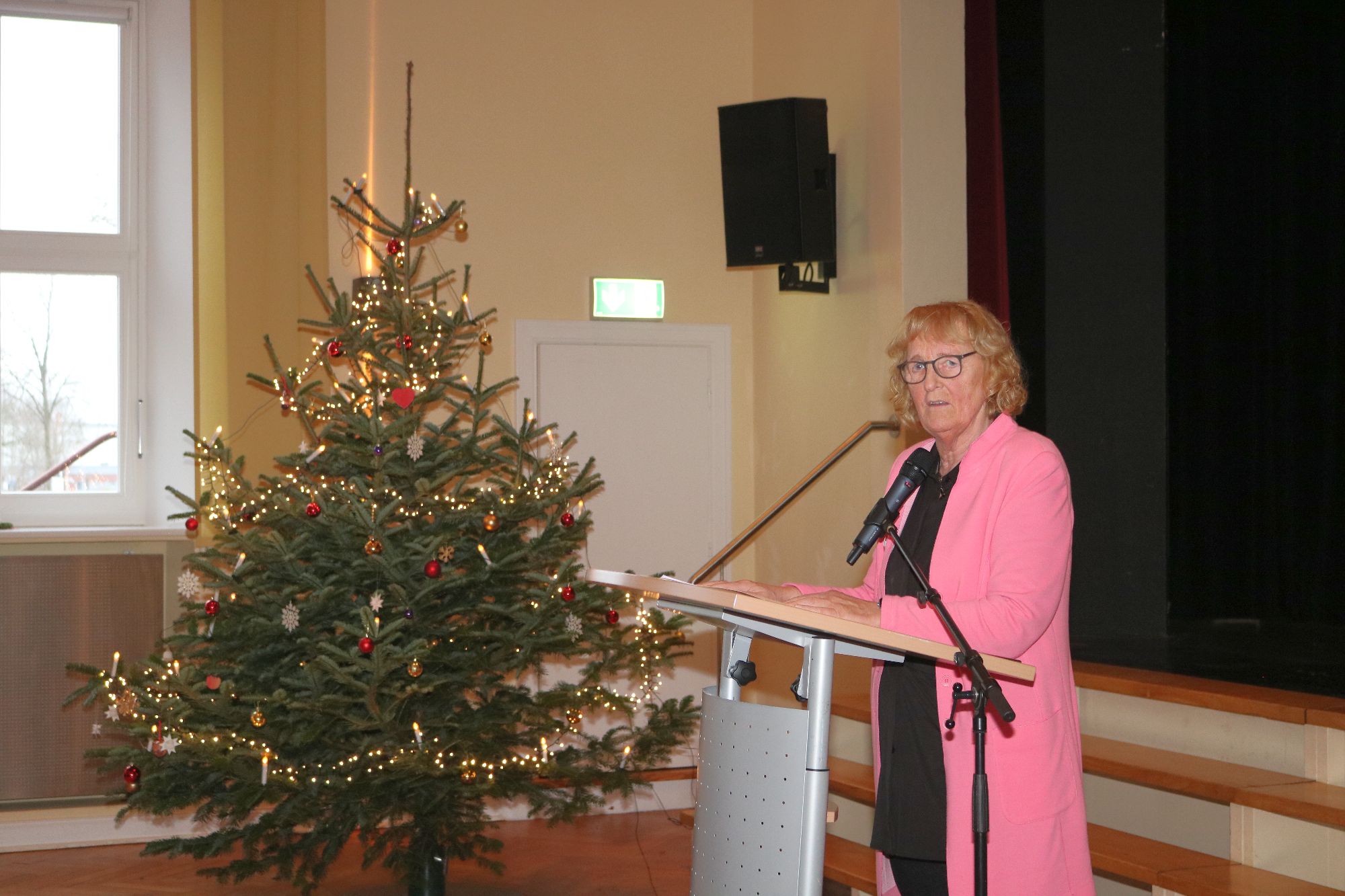 Nach der Begrüßung durch Bürgervorsteherin Karin Martens folgten Grußworte der Gäste – Amtsvorsteher Ingo Böhm, Pastorin Christine Pihl von der Læk Danske Kirke, Pastor Dr. Lars Emersleben von St. Willehad und Akademieleitung Aaron Jessen schafften es mit kurzen, knackigen Grußworten die rund 130 geladenen Gäste direkt in weihnachtliche Stimmung zu bringen – und das in knapp 16 Minuten! Denn um 14:15 Uhr stand schon das Kaffeetrinken auf dem Programm – während auf der Empore schon Eltern und Geschwisterkinder unserer Grundschule an der Linde Leck auf den Auftritt des Kinderchores warteten, gab es im Festsaal erst einmal leckere Weihnachtstorte.