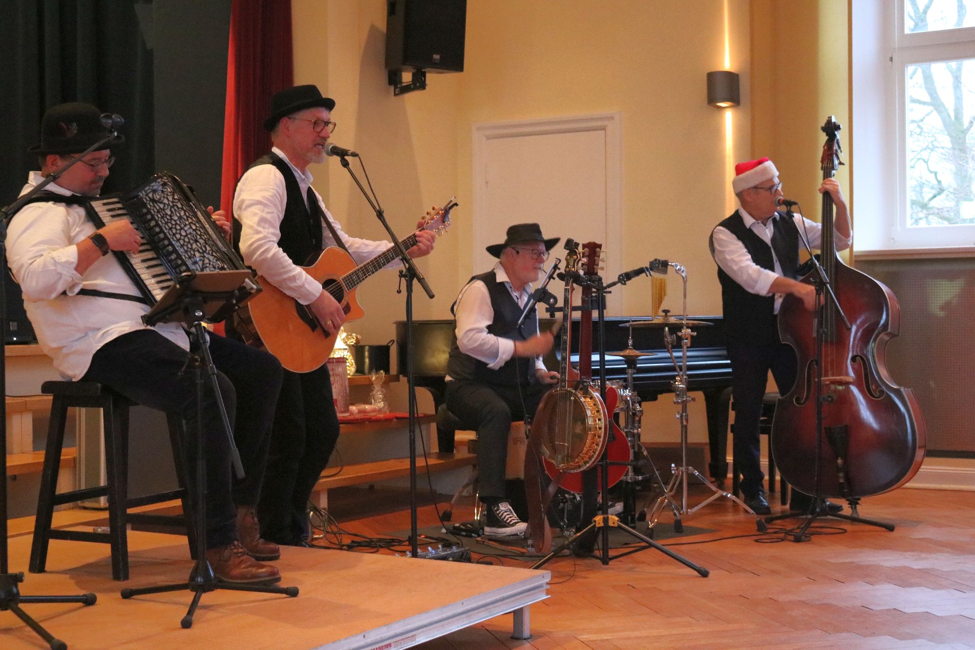 Thomas Wieder (Akkordeon), Jørgen Ehlers (Gitarre und Banjo.), Arne Linde (Schlagzeug) und Winnie Zastrow (Kontrabass) brachten plattdütsche Gassenhauer, irische Seemannslieder, böhmische Polkas und spanische Weihnachtslieder zu Gehör, die bei der Zugabe am Ende den ganzen Saal zu den Klängen von „Auf der Reeperbahn nachts um halb eins“ zum Mitsingen und Schunkeln brachten…