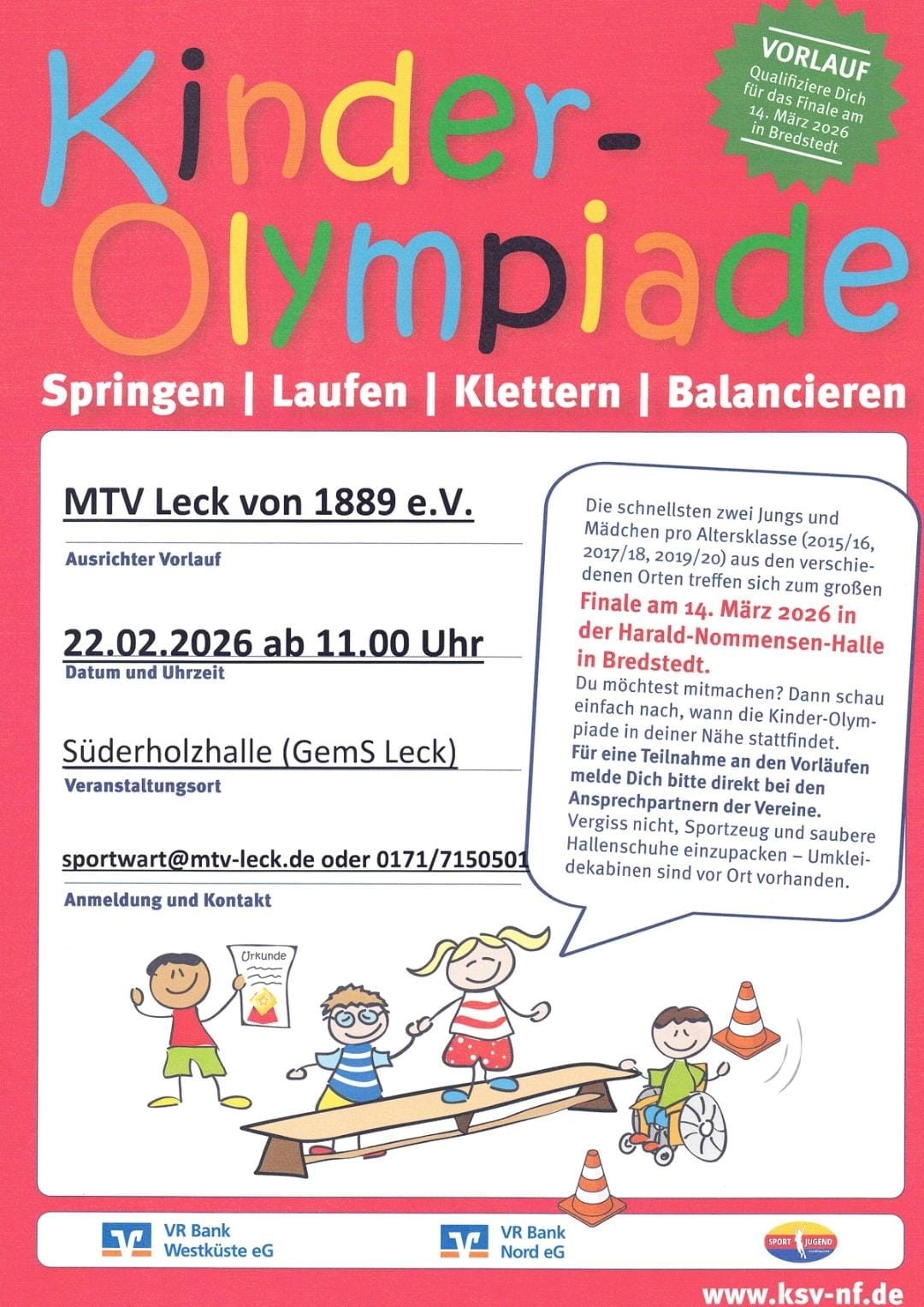 Der MTV Leck veranstaltet am Sonntag, den 22. Februar 2025 ab 11 Uhr für alle Kinder der Jahrgänge 2015 – 2020 den Vorlauf für die 14. Nordfriesische Kinder Olympiade in der Süderholzhalle (Am Süderholz 13F, Gemeinschaftsschule).