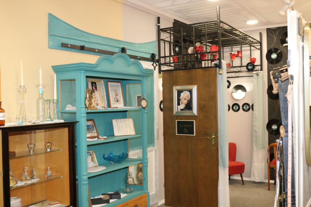 Und wer ganz genau hinsieht, entdeckt vielleicht das ein oder andere Möbelstück aus anderen Lecker Geschäften. Ins Auge fällt das riesengroße Regal direkt am Eingang rechts mit dem Tresen. Es stammt aus dem Laden „Ketel Trepp“, der vor vielen Jahren geschlossen wurde. Beim Räumungsverkauf hatte der Geschichtsverein Leck und Karrharde e.V. einige Stücke des historischen Ladenmobiliars bekommen. Dieses große Stück fand aber aufgrund seiner Größe bislang keinen neuen Wirkungskreis. Janyna Görlich hat das imposante Teil komplett abgebeizt, dem Holzwurm den Garaus gemacht und es ihrem Design angepasst.