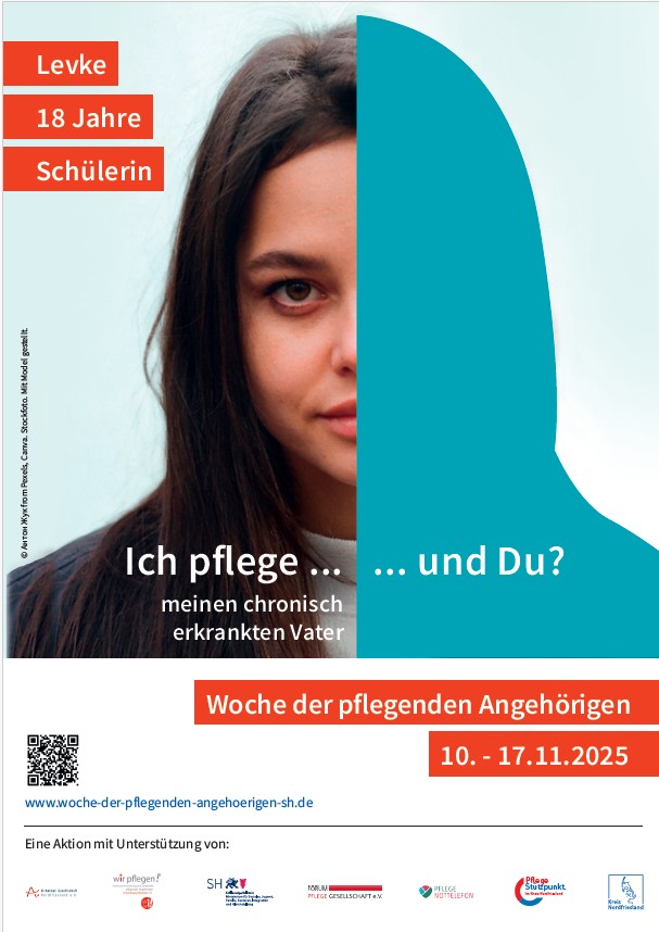Zudem verweisen die Plakate per QR-Code auf die Internetseite www.woche-der-pflegenden-angehoerigen-sh.de. Hier finden Interessierte auch Informationen zu anderen Veranstaltungen, die während der Aktionswoche stattfinden – unter anderem in Risum-Lindholm, Bredtstedt, Breklum und Niebüll. Die landesweite „Woche der pflegenden Angehörigen“ wird von wir pflegen e.V., der Interessenvertretung und Selbsthilfeorganisation pflegender Angehöriger, federführend organisiert.