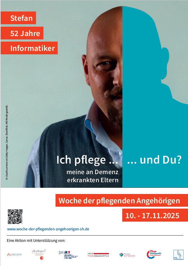 Mehr als 80 Prozent der Pflegebedürftigen in Schleswig-Holstein werden nicht in Heimen, sondern von ihren Familien und Freunden betreut. Über 200.000 Menschen im Land leisten damit täglich wertvolle Unterstützung und stellen ihre Pflege sicher. Auf die oft unsichtbare, aber unverzichtbare Arbeit pflegender Angehöriger möchte der Kreis Nordfriesland in den kommenden Wochen zudem mit Plakaten im Kreisgebiet aufmerksam machen. Unter dem Titel „Ich pflege – und du?“ geben sie fünf Pflegegründen – Schlaganfall, Demenz, chronische Erkrankung, Behinderung und Parkinson – ein fiktives Gesicht. Denn eines steht fest: Das Thema Pflege kann jeden von uns jederzeit ereilen – egal welchen Alters.