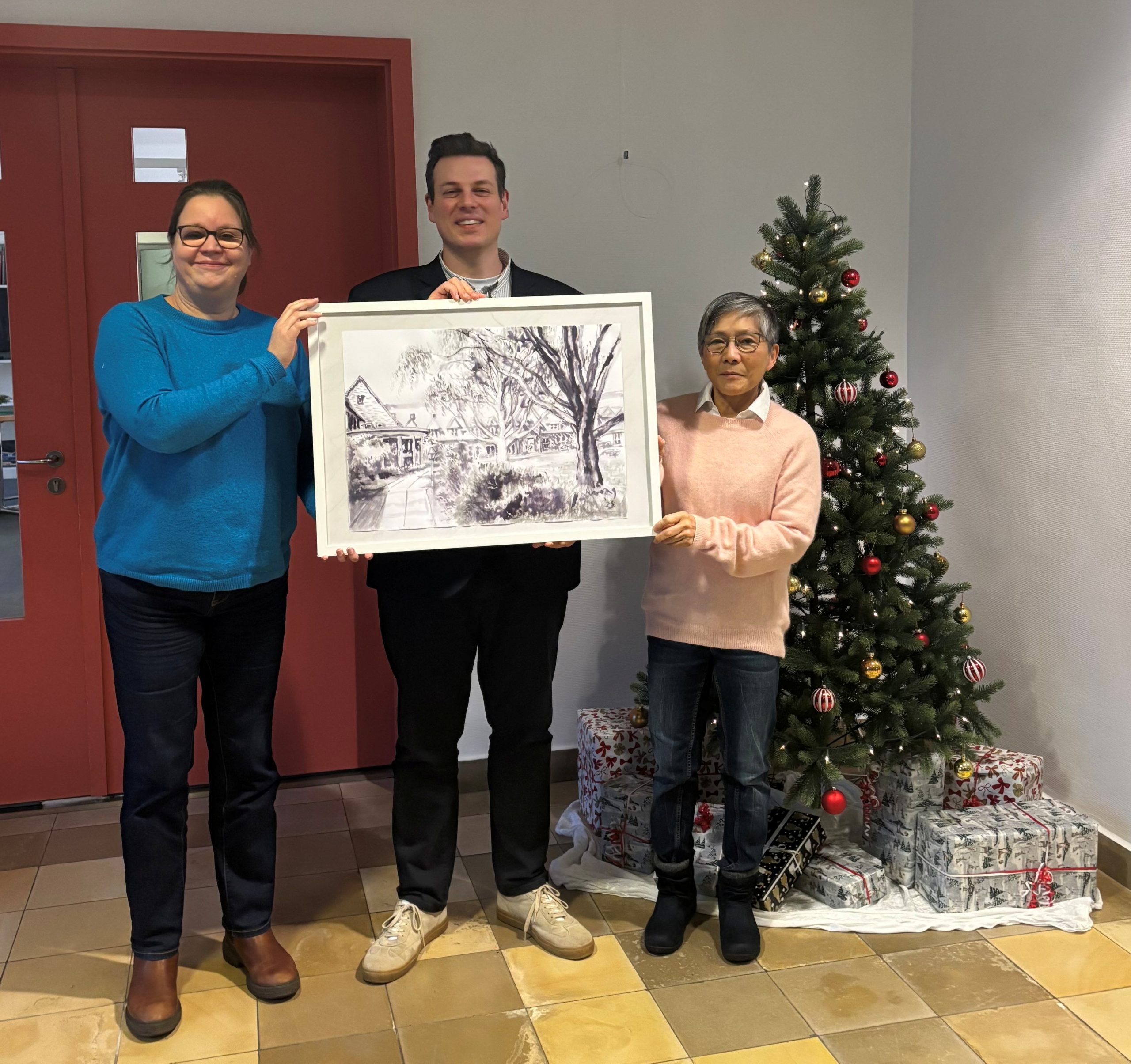 Zum Abschluss ihrer Ausstellung hat die Künstlerin Cam Phuong Hua-Nguyen der Nordsee Akademie ein besonderes Werk überreicht: eine Tuschezeichnung der Nordsee Akademie. Akademieleiter Aaron Jessen freut sich sehr über das Geschenk, das einen besonderen Platz erhalten wird.