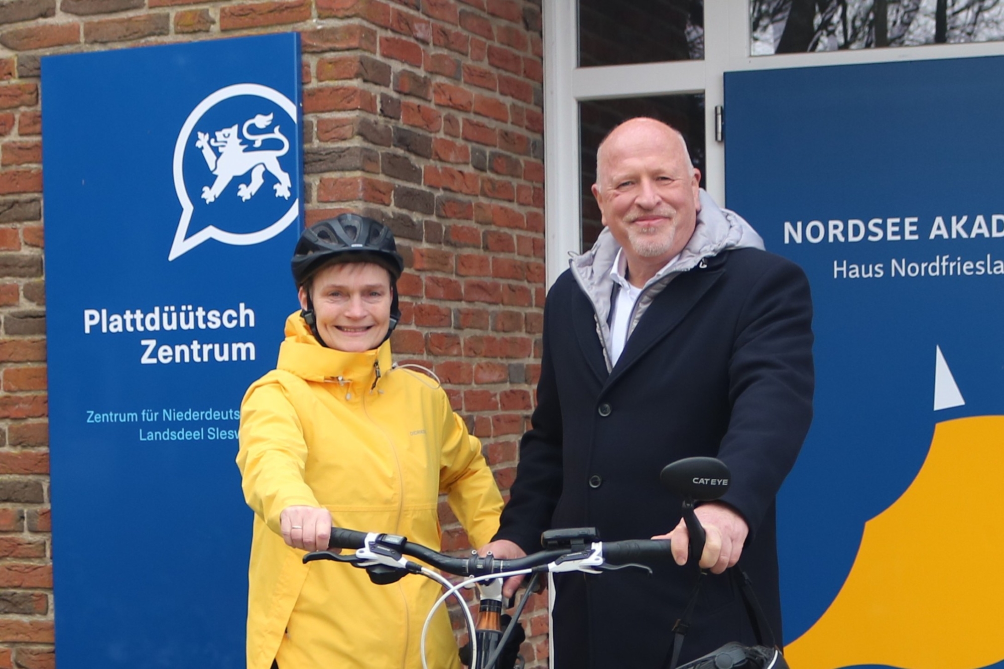 Gesa Retzlaff, Geschäftsführerin des Vereins Plattdüütsch Zentrum Landsdeel Sleswig e. V. freut sich mit Bürgermeister Andreas Deidert über die Kooperation!