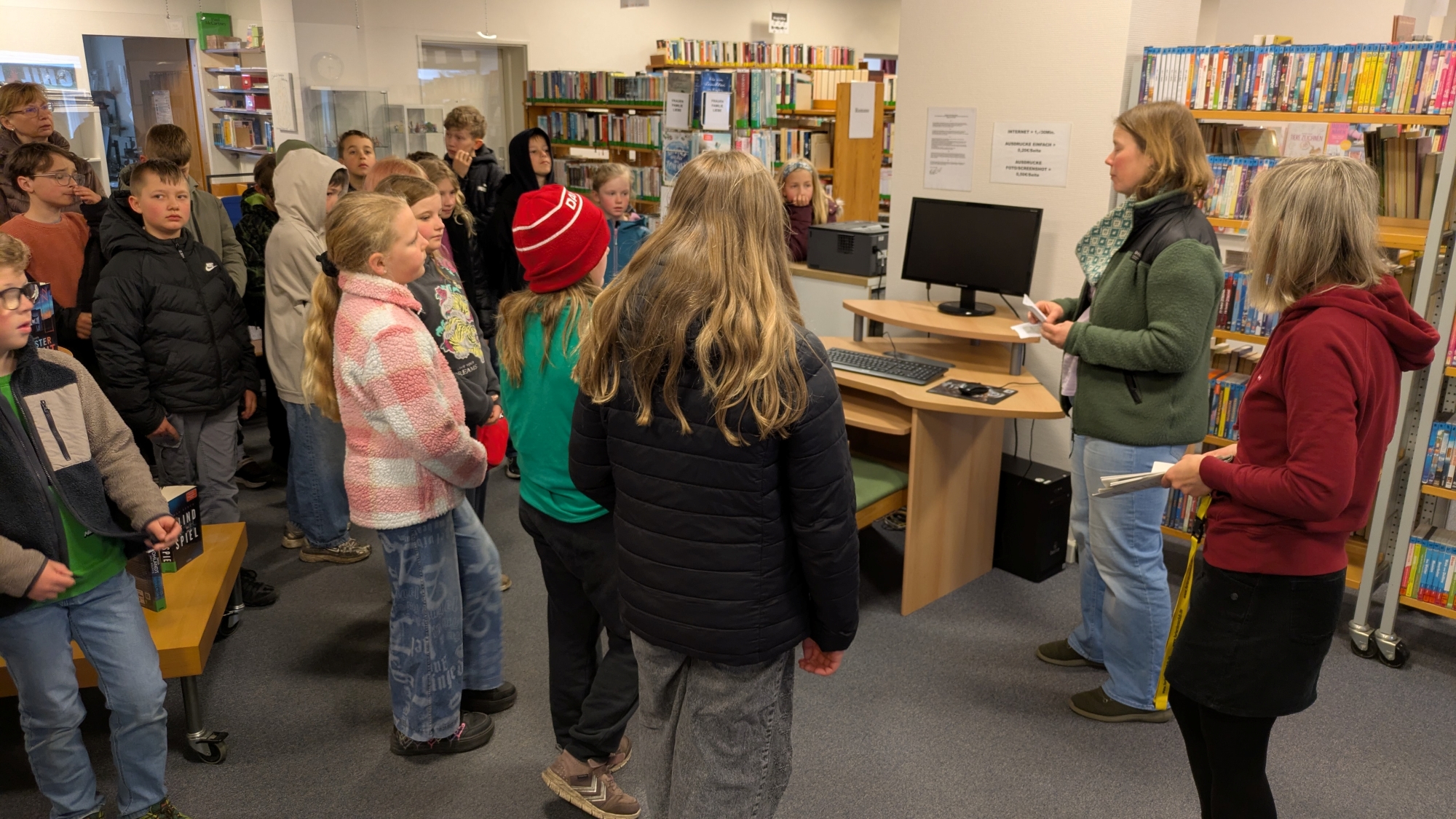 In der Buchhandlung begrüßte Inhaberin Wiebke die Kinder und gab spannende Einblicke in die Welt des Buchhandels. Mit viel Engagement erklärte sie, wie Bücher ihren Weg ins Regal finden, und beantwortete geduldig die zahlreichen Fragen der Schülerinnen und Schüler. Anschließend ging es weiter in die Lecker Bücherei, wo Berit die Gruppe empfing und die vielfältigen Angebote der Einrichtung vorstellte. Ein besonderer Höhepunkt war eine Rallye mit verschiedenen Aufgaben rund ums Lesen, die Wiebke und Berit gemeinsam vorbereitet hatten. Mit Neugier und Teamgeist lösten die Kinder die Stationen und entdeckten dabei spielerisch, wie lebendig und abwechslungsreich die Welt der Bücher ist.