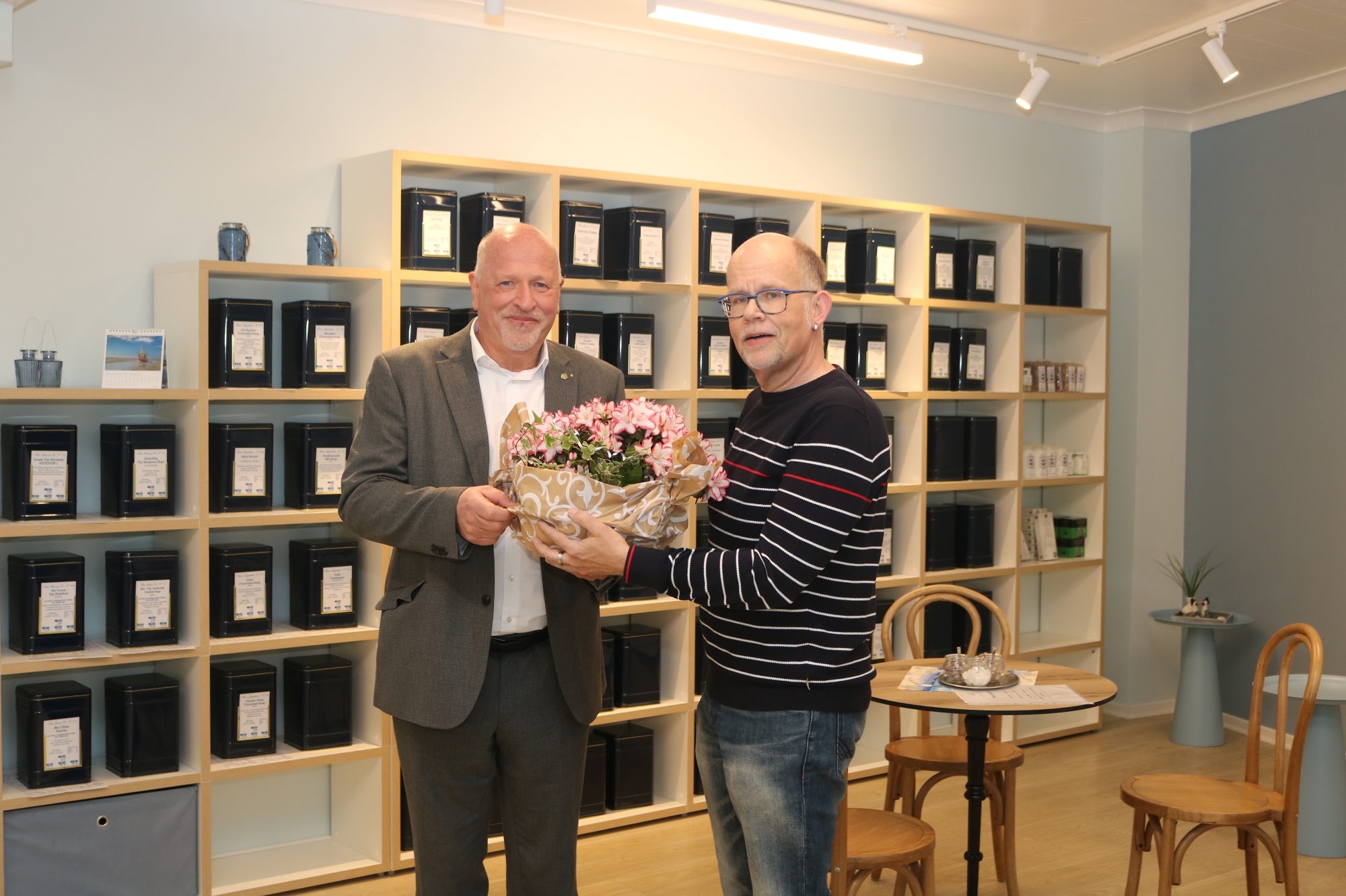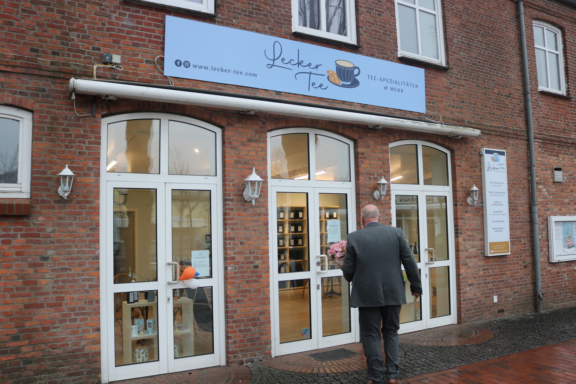 Zur Eröffnung des neuen Angebotes am Kirchplatz hat sich kürzlich auch Bürgermeister Andreas Deidert auf den Weg gemacht. Gemeinsam mit Gemeindemanagerin Sabine Schwarz überreichte er einen Blumengruß an Dr. Andreas Bonnermeier, den Inhaber des neuen Teegeschäftes „Lecker Tee“.