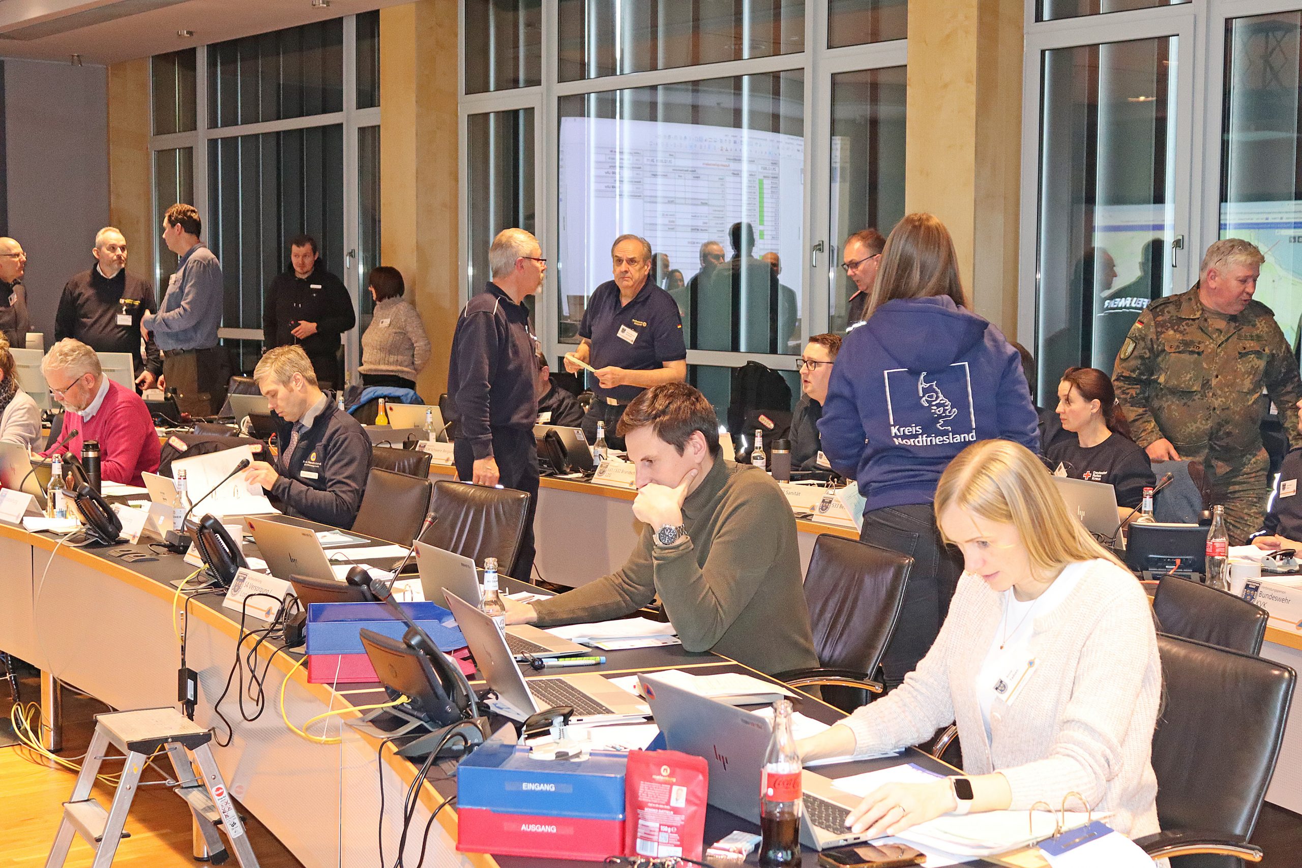 Landrat Florian Lorenzen rief in der Übung seinen Führungsstab zusammen, um ein fortlaufend aktualisiertes Lagebild zu erhalten und Maßnahmen vorzubereiten. Zum Stab gehören ehrenamtlich Tätige – sie kommen aus der Feuerwehr, dem THW, dem DRK, der Psychosozialen Notfallvorsorge und der »Regieeinheit Information und Kommunikation« des Katastrophenschutzes – sowie hauptamtliche Vertreter des Landesbetriebes für Küstenschutz, Nationalpark und Meeresschutz, der Landespolizei, der Bundeswehr, des Klinikums Nordfriesland sowie der Kreisverwaltung. Ihre zentralen Aufgaben umfassen die Führung einer Lagekarte, die Organisation von Personal- und Materialressourcen, die Sicherstellung belastbarer Kommunikationswege, die Vorbereitung von Evakuierungsunterkünften sowie die enge Abstimmung mit den acht regionalen Krisenstäben im Kreisgebiet und dem der Landesregierung.