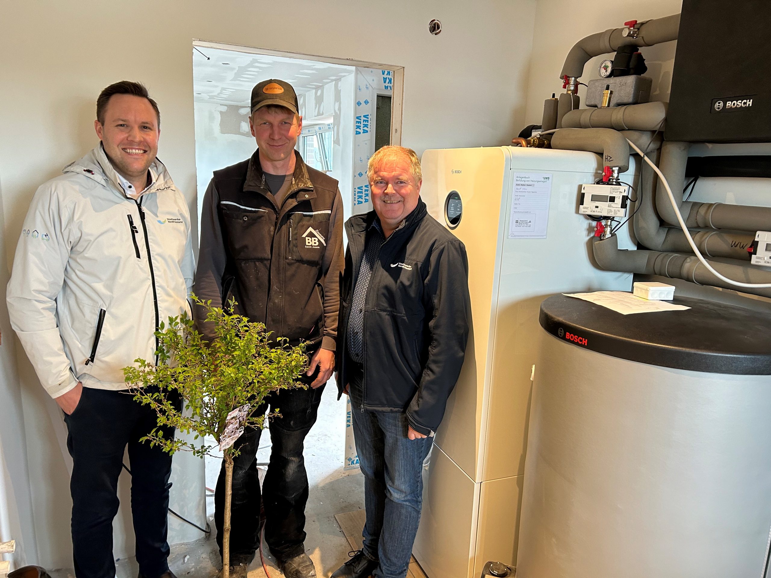 Frank Christiansen (Stadtwerke Nordfriesland) Eigenheimbesitzer Gerrit Jessen und Joachim Pilz (Stadtwerke Nordfriesland ) an der hauseigenen Wäremepumpe im neuen Eigenheim im Neubeaugebeit Leck, Mühlenberg II