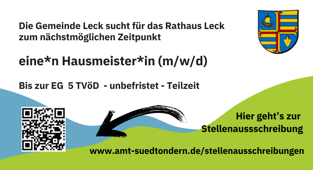 Die Gemeinde Leck sucht zum nächstmöglichen Zeitpunkt eine*n Hausmeister*in (m/w/d) für das Rathaus.