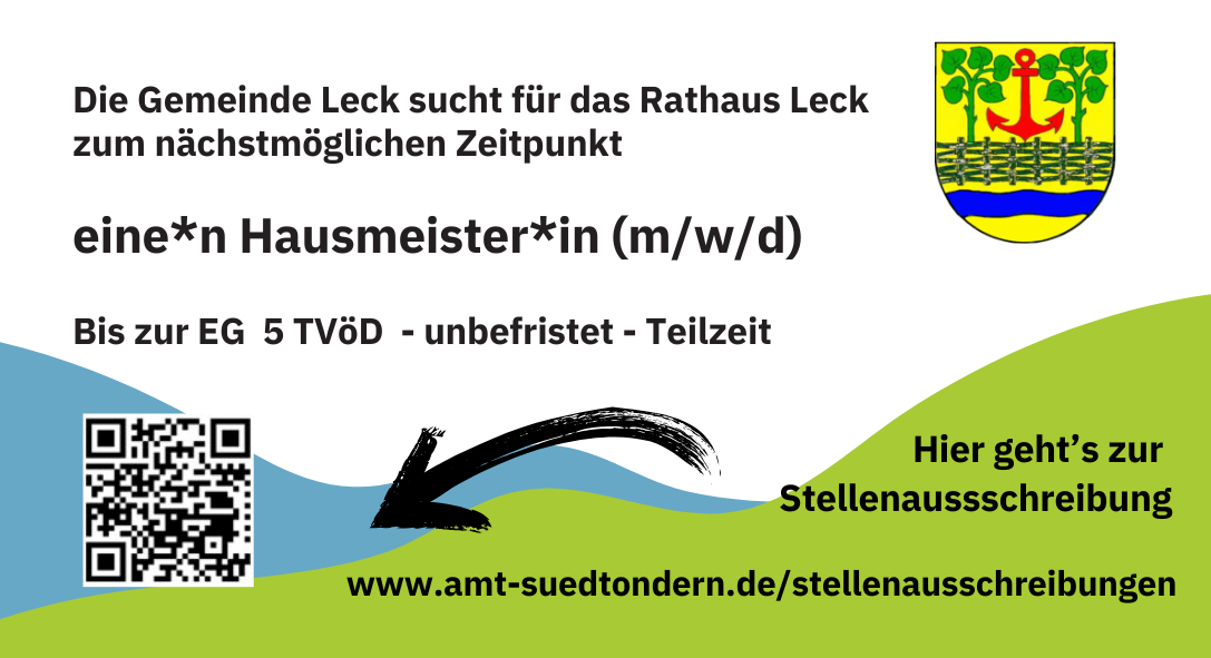 Die Gemeinde Leck sucht zum nächstmöglichen Zeitpunkt eine*n Hausmeister*in (m/w/d) für das Rathaus.