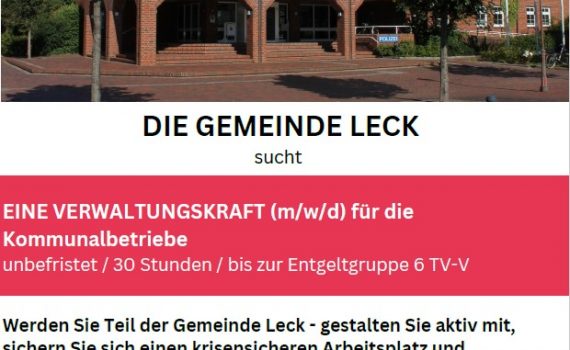 Die Kommunalbetriebe der Gemeinde Leck suchen möglichst zum 01.03.2026 eine Verwaltungskraft (m/w/d). Es handelt sich um eine unbefristete Teilzeitbeschäftigung […]