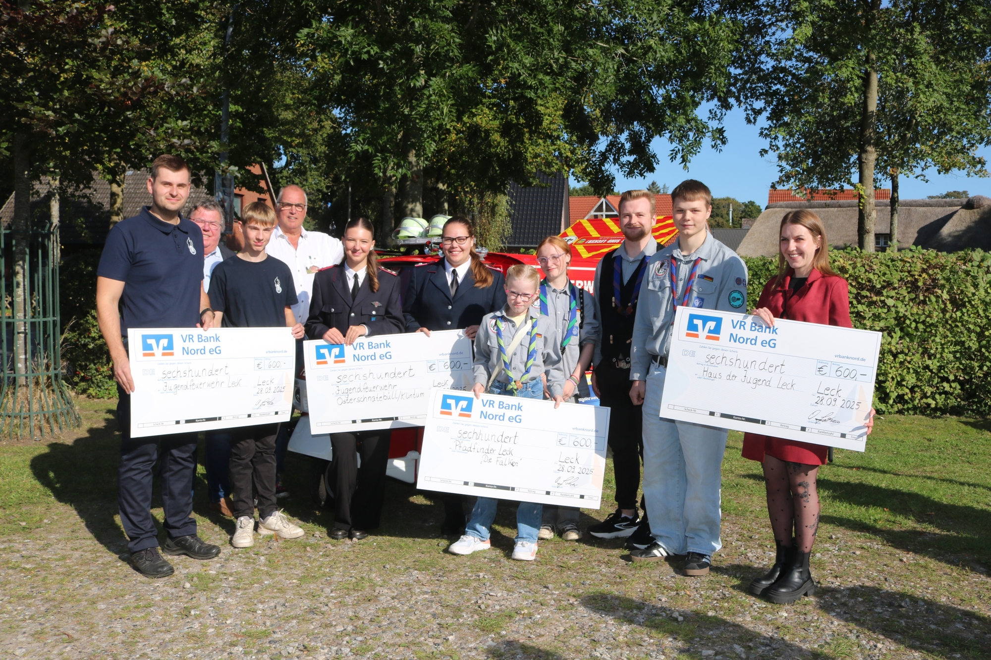Bedacht wurden die Jugendfeuerwehren aus Leck und Oster-Schnatebüll/Klintum, die Pfadfinder Leck „Die Falken“ sowie das Haus der Jugend Leck. (von links, im Hintergrund Otmar Löhrer und Peter Kaim)