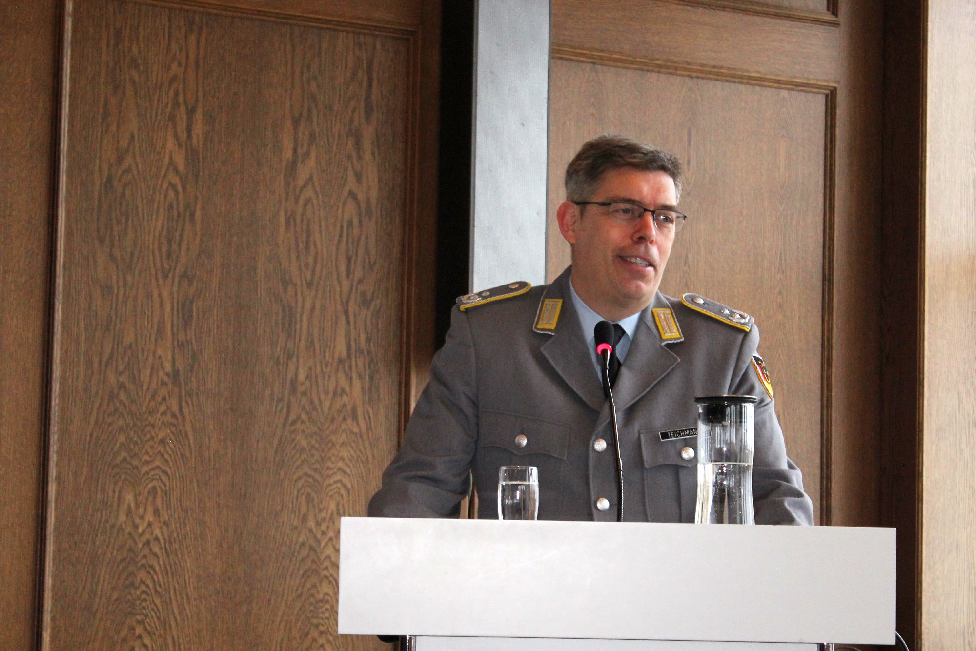 Oberstleutnant Lars Teichmann schloss sich mit einem weiteren Grußwort an. Er hielt einen Rückblick auf das, was die Bundeswehr im vergangenen Jahr bewegte: die in-Dienst-Stellung der Panzerbrigade 45 in Litauen, der erste Nationale Veteranentag, 70 Jahre Bundeswehr, der Stopp der Konversion und die Vorbereitung des neuen Wehrdienstes. Einmal mehr dankte er für die Akzeptanz der Bundeswehr in der Region und schloss damit sein letztes Grußwort, denn im März wird es einen Wechsel geben. Bereits jetzt schon am Standort ist Oberstleutnat Jörg Söder als neuer Kommandeur. Auch er nahm am Neujahrsempfang der Gemeinde Leck teil.