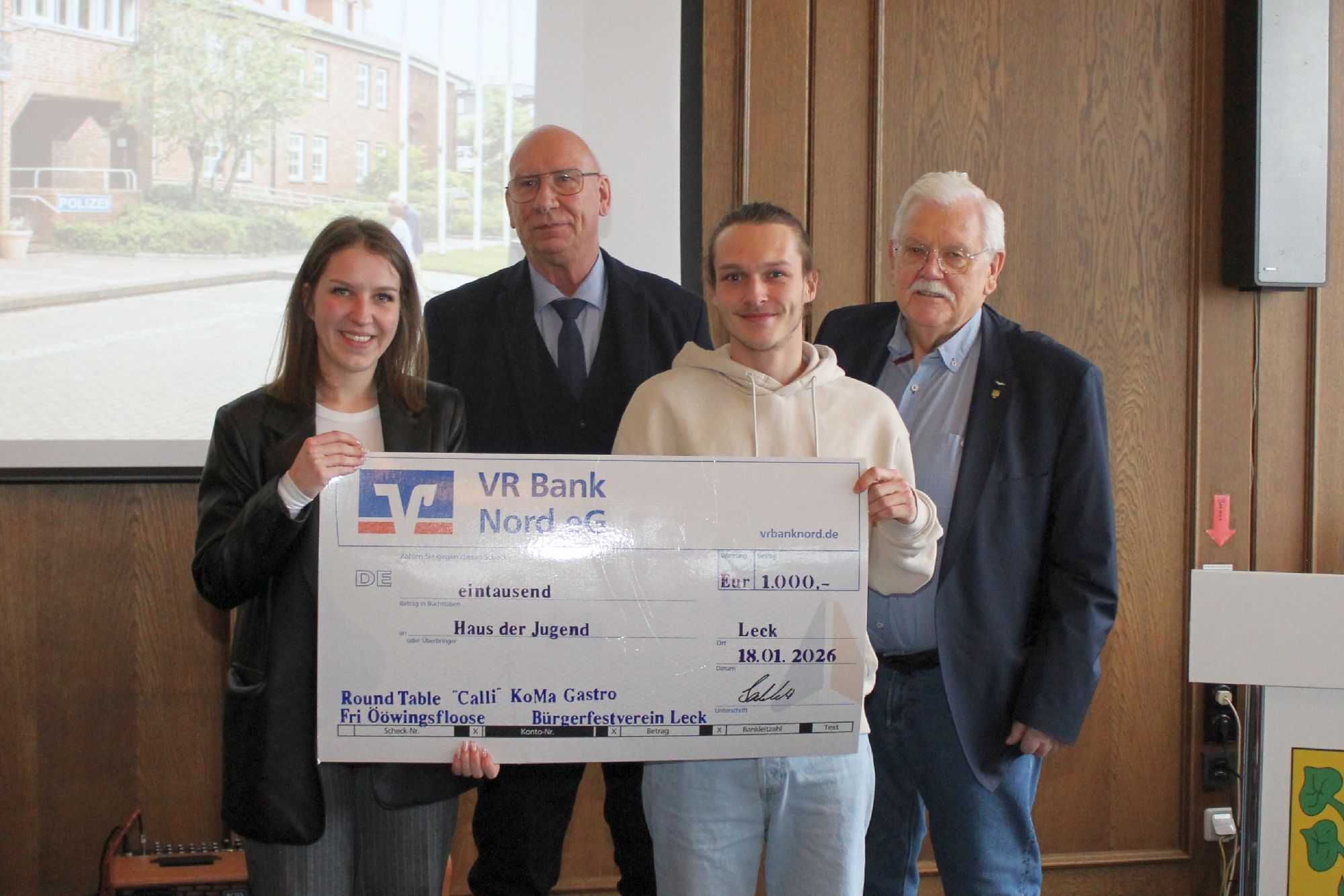 Sehr gefreut über die Anerkennung ihres Engagementes haben sich auch die Leiterin unseres Haus der Jugends, Celine Garcia mit ihrem Kollegen Moritz Garcia – sie durften sich über eine Spende von 1.000 € freuen, die der Bürgerfestverein Leck e.V., Calli Schaschlik, die Fri Ööwingsfloose, der RoundTable 88 und das Töff/Colle beim Abpunschen im Lecker Weihnachtsmarkt zusammen gelegt haben. Über die Verwendung des Geldes werden die Kinder und Jugendlichen demnächst selbst entscheiden, denn im Rahmen von Mitbestimmung und Partizipation sollen auch die Besucherinnen und Besucher im Haus der Jugend an den Entscheidungen mitwirken.